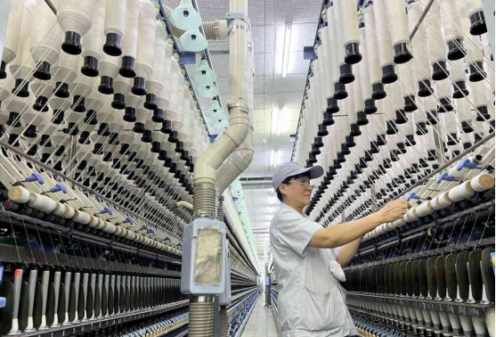 在棉纺车间,整齐排列的自动化生产线映入眼帘,敞亮干净的室内环境令人身心愉悦。行走其中,工人并不多见,只有电机发出的轰轰声。-排排纱锭在智能化生产线上有序旋转,宛如一个个翩翩起舞的小精灵,卷起一根根或粗或细的纱线。更为神奇的是,该车间自己“会呼吸”,温度基本控制在23℃到31℃之间,体感非常舒适,