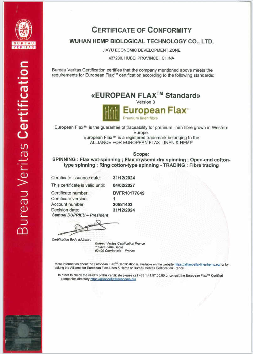我司通过欧洲亚麻与大麻联盟(CELC)授权、必维国际检验集团(Bureau Veritas)的严苛审核,获得EUROPEAN FLAX®(欧麻)认证,标志着公司在亚麻原料品质、生产环保标准及全产业链可追溯性方面,达到欧盟权威认可的国际一流水平,为产品进军全球高端市场奠定坚实基础。